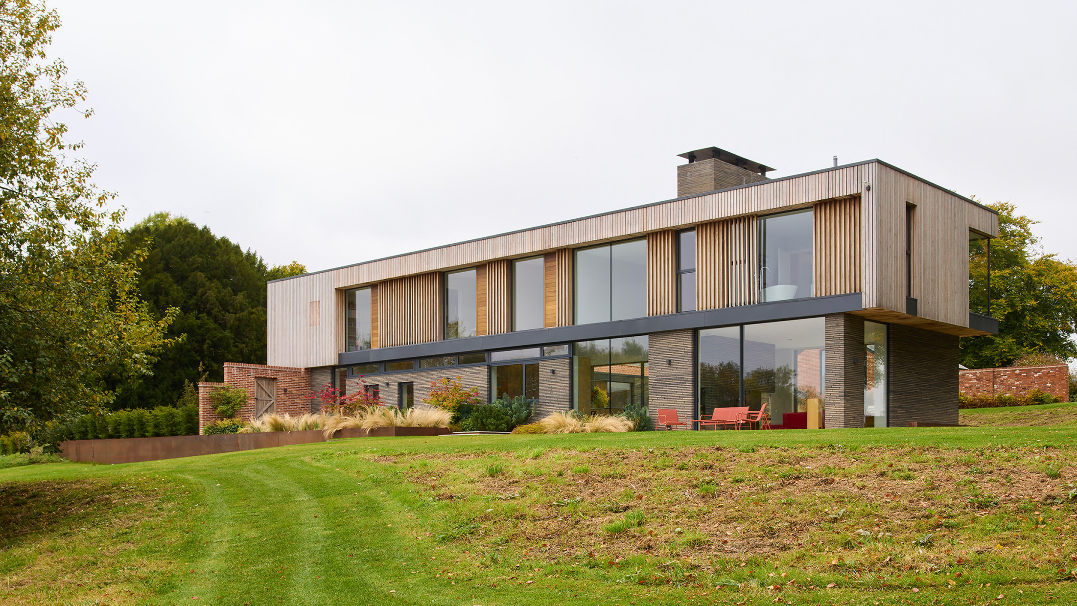 The house therefore sits behind a ‘garden wall’, with the main body as a 2-storey form lying north-south, so presenting a narrow end to the approach allowing all rooms to address the long views east and west.