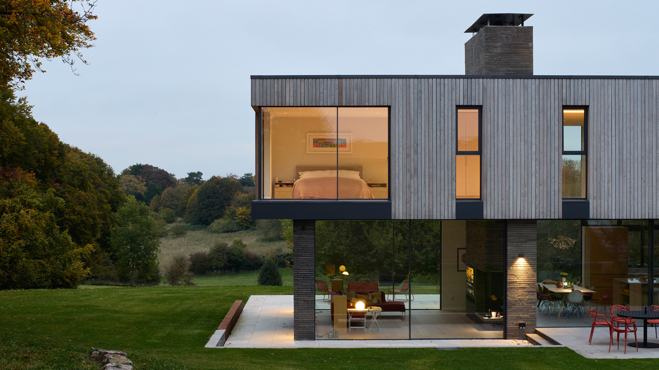 An orange-red stock brick to closely match the existing structures will form the front wall of the house facing the entrance court. Beyond the wall, we use an earthy grey brick, used in panels set between full-height glazing to ground floor, while sweet chestnut vertical boarding is used to clad the upper volume and a clear protective stain coating that weathers to a slightly white tone. Aluminium windows will have a bronze anodized finish. Oiled iroko form the opening ventilation panels and vertical privacy slats.