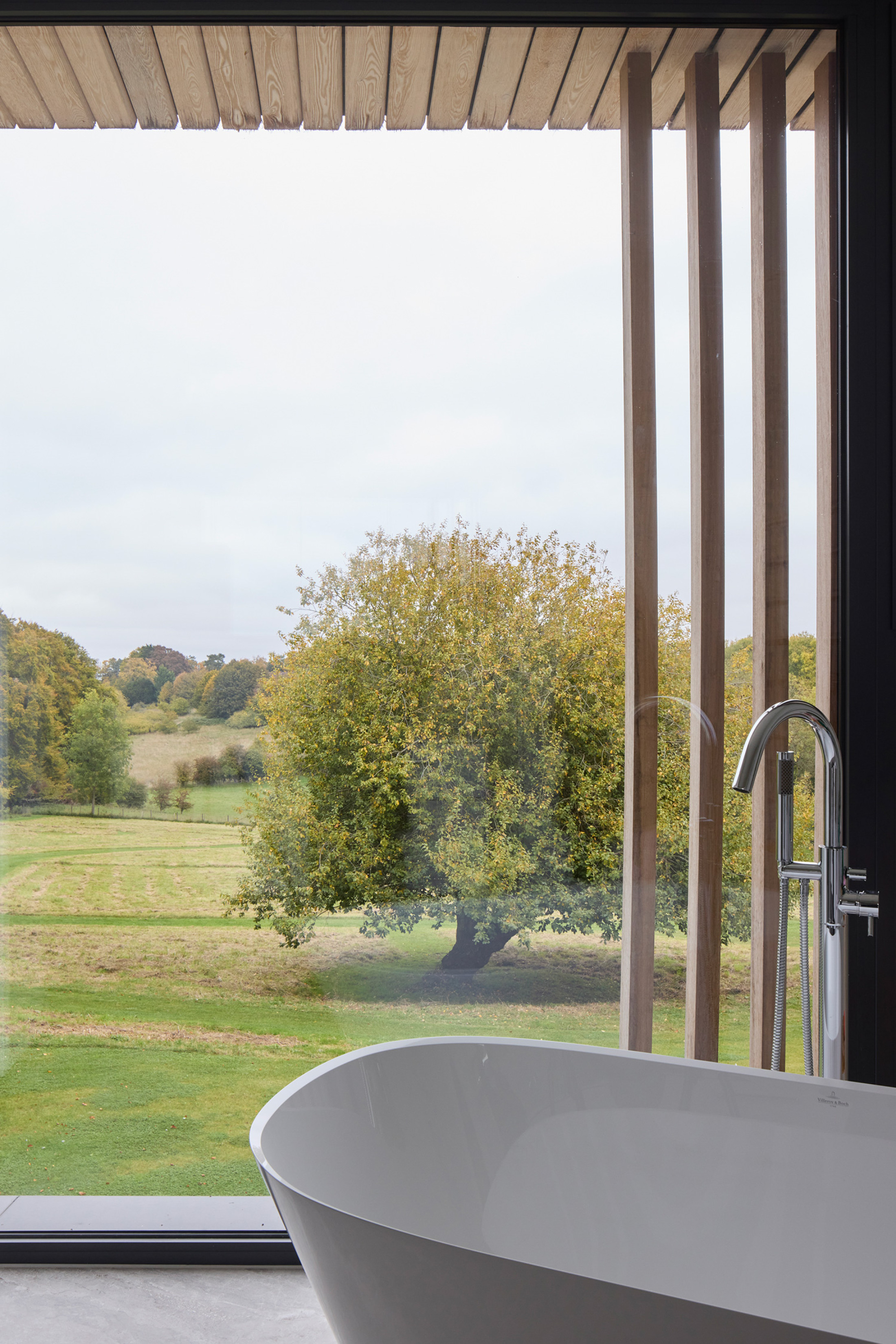 From the entrance hall, a circulation route provides a view along the length of the house and provides access to a study, cloakroom/utility room, kitchen, a double-height dining space and down a couple of steps adjoining a chimney stack, into the main living room which enjoys panoramic views of the surrounding meadows and trees.